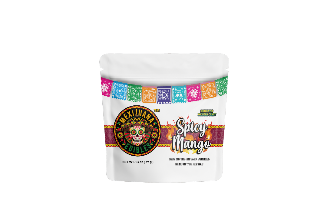 Spicy Mango Gummies: Sugar, Natural Corn Syrup, Water, Pectin, Chamoy (Sugar, Water, Iodized Salt, High Fructose Corn Syrup, Citric Acid, Xanthan Gum, Red Peppers, Modified Corn Starch, Sodium Citrate, Acetic Acid), Sodium Benzoate (Preservative), Artificial Colors, FD&C Red 40, FD&C Yellow 5, Salt, Dehydrated Lemon, Chili Powder, Citric Acid, Silicon Dioxide (As Anti-Caking Agent), Less than 2% of the following: Spices, Cannabis.